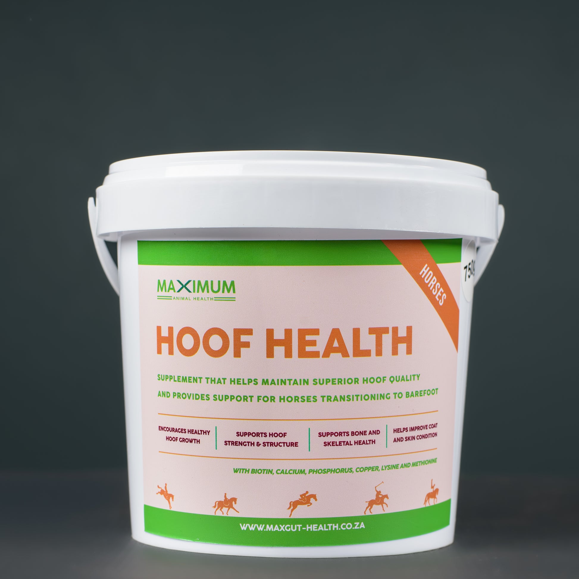 Max Hoof Health is an advanced supplement that has been formulated to help maintain hoof quality and to support bone and skeletal wellbeing for horses of all ages in work, convalescence, and retirement that includes ingredients that have been shown to support your horse and incorporates the latest global scientific research producing a modern product to help support your horses Hoof & Bone wellbeing.